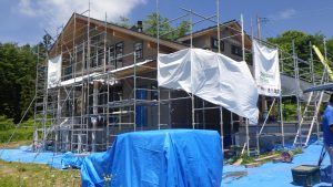 大泉に会社がある、浅川建工様の仕事です。とても個性があり、大自然に 良く合う建物です、外壁は通気ラスモルタル、ジョリパット仕上です。 内部は漆喰の予定です。