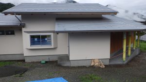 足場もようやく外れました、この時期としては、全体にうまくまとまり よい仕上がりになりました、玄関はモルタル炭入りです