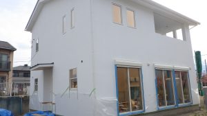 今回初めて施工させて頂いた工務店様の仕事です 下地はざら板ですモルタルを塗った上に、吹付です真っ白な壁でとても清潔感があり ます。