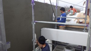 中塗りが終わりました。この壁は横からの日差しが まともに当たります、かなり大変でしたが仲間の チームワークが良く平らな壁になりました 若い力どんどん成長していき凄く嬉しいです。