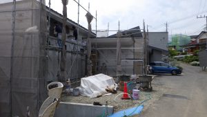 長坂の新築現場です、スタジオアンビエンテ窪田さんの設計です 外壁モルタルぬり、仕上げは細粒リシン吹付です。 奥に見える物件も以前施工させて頂きました。