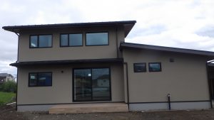 外壁は通気ラスモルタル下地で、仕上げはstoロータサンです。 デッキと玄関タイルも施工しました。