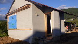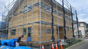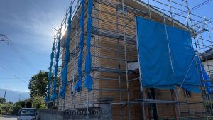 飯田工務店さんのお仕事です。 外壁モルタル塗り、仕上げは吹付になります。 ダブル断熱で、断熱性能ばっちりです。