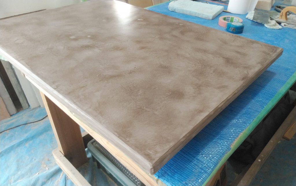 コンクリートのような質感から石や金属のような表情までつくれる左官材。水まわりにも使え、薄塗りでも強度が高い仕上げです。